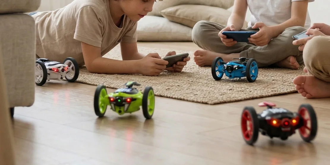 Control interfaces are placed on the front, with buttons and LEDs sized and spaced for easy use by children. Light and sound effects offer real-time feedback during operation. The top panel includes ports for external devices or expansion modules, supporting future upgrades. Vivid primary colors dominate the palette, matching the competitive spirit of battle play, while matte finishes reduce glare and visual fatigue.