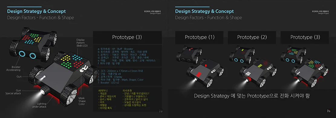 Smart Battle Toy는 조형적 완성도와 사용자 중심의 구조적 설계를 통해, 인터랙티브 배틀 로봇이라는 장르 내에서 새로운 기준점을 제시한다. 디자인은 제품을 단순히 “보는 대상”이 아니라, 직접 참여하고 변형할 수 있는 “놀이의 도구”로서 접근하고 있으며, 이는 놀이와 학습이 통합되는 미래형 완구 디자인의 방향성을 제시하고 있다.