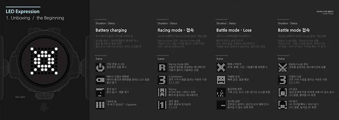 Smart Battle Toy의 상단에는 다양한 커넥터 포트를 내장하여, 외부 디바이스와 연동하거나 확장 모듈을 장착할 수 있도록 설계되었다. 이는 향후 다양한 콘텐츠나 기능이 추가될 수 있도록 여지를 두는 디자인 전략으로, 장기적인 제품 활용도를 높인다.