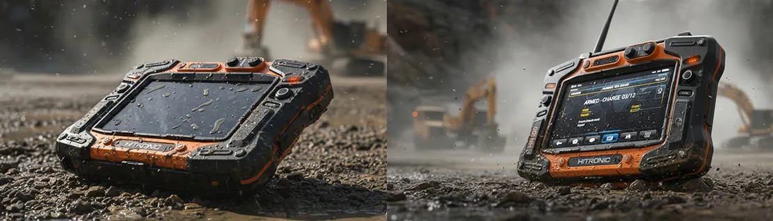 Complementing the blasting unit, the communication and setup devices adopt a sleeker form factor with curved surfaces and slim profiles to fit comfortably in the user’s hand. Rubberized side panels offer additional grip and impact resistance, ensuring durability during field operations. These handheld devices maintain a visual and material coherence with the main unit, reinforcing a cohesive identity across the system.