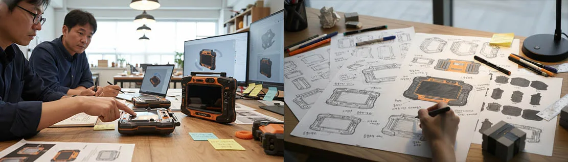 통신기와 초기 설정기는 그립감과 직관적 사용성을 고려해 보다 슬림하고 손에 잘 맞는 형태로 디자인되었습니다. 통신기의 측면은 고무 몰딩으로 마감되어 외부 충격에 강하며, 손에 쥐었을 때 안정적으로 고정되도록 설계되었습니다. 초기 설정기는 스마트 디바이스 기반의 UI를 갖추고 있으나, 일반적인 소비자용 모바일 기기와는 다른 견고한 외형을 지니고 있습니다. 거치대를 포함한 일체형 구조는 장시간 사용과 야외 환경에서의 안정적인 작동을 가능하게 합니다.