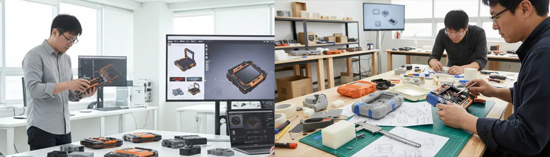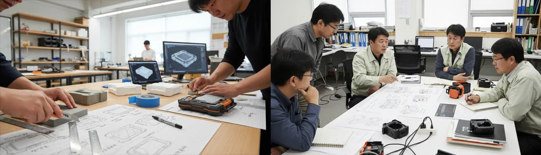 사용성을 고려한 세부 설계도 이 제품의 경쟁력을 높이는 요소입니다. 커넥터의 방향성과 결속 구조, 손잡이의 곡률과 표면 텍스처, 각 장비의 무게 배분은 실제 사용자의 동작 흐름을 반영한 결과물입니다. 전자 뇌관의 삽입 및 탈착 구조는 안전성과 정확성을 최우선으로 고려하였고, 재질과 형상의 선택은 외부 환경에 영향을 덜 받도록 설계되어 있습니다.