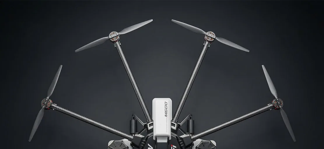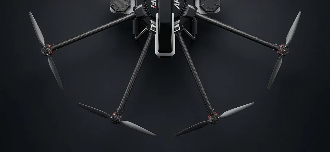 AF-52는 2870mm의 넓은 축간 거리와 730mm의 낮은 높이 비율을 바탕으로 시각적 안정성과 물리적 균형감을 동시에 구현합니다. 8개의 로터가 대칭형 X구조로 배치되어 있어 공기역학적 효율을 높이고, 비행 중의 진동을 최소화하며, 강한 바람이나 급변하는 환경에서도 안정적인 비행이 가능합니다. 로터 암은 직선과 곡선이 결합된 입체적 형태로 조형미를 더하며, 시각적으로는 빠른 속도감과 기능적 역동성을 동시에 전달합니다.