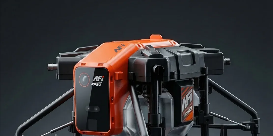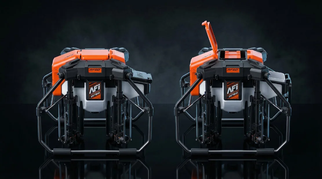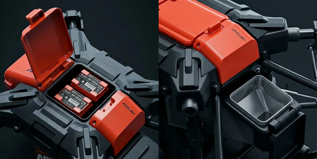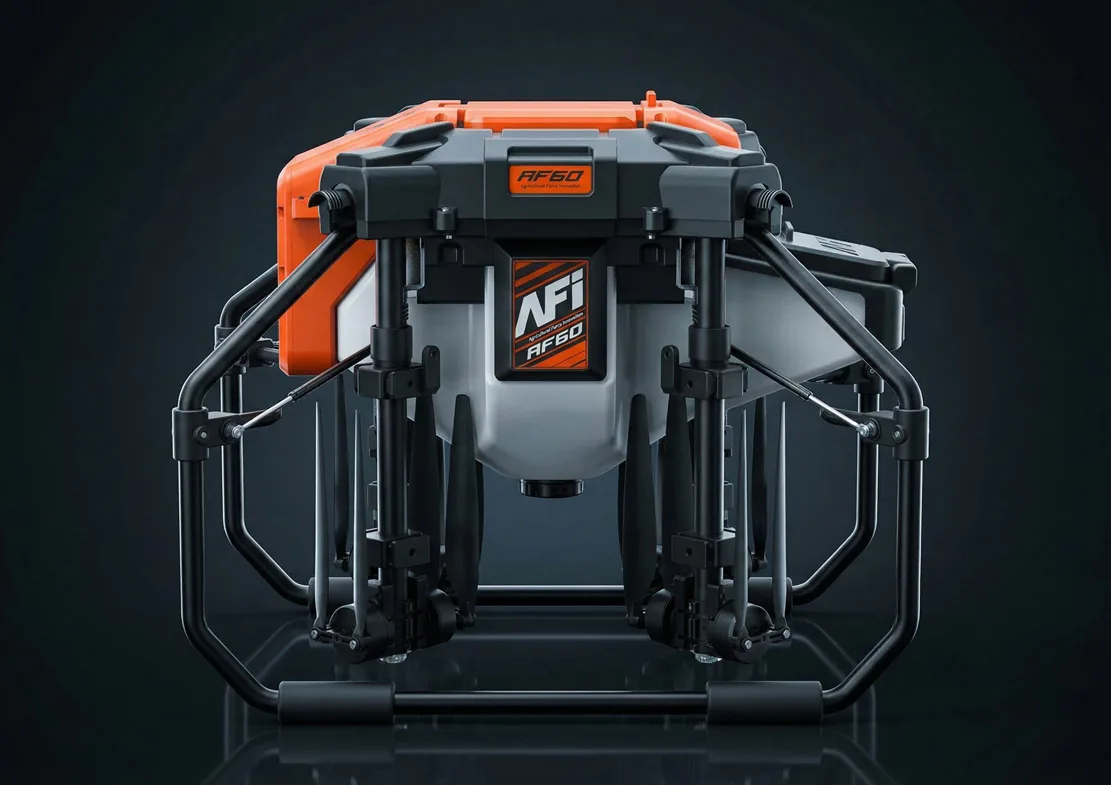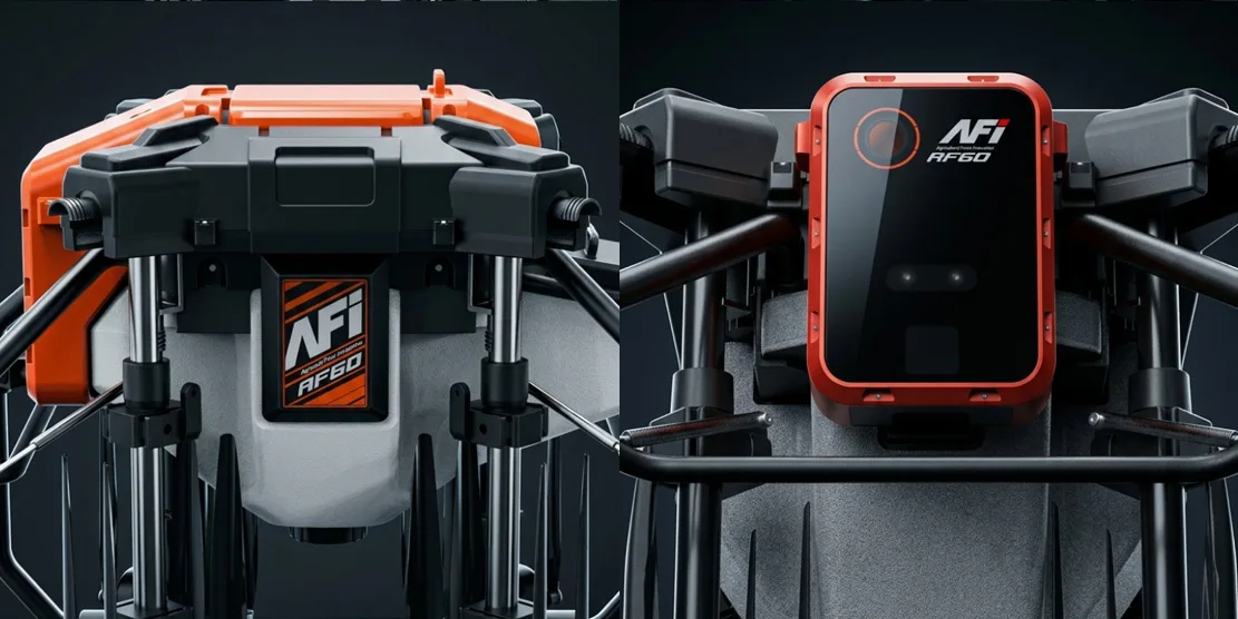 AF-120의 디자인은 기능성과 사용성을 동시에 고려하여 설계되었습니다. 60리터의 대용량 약제 탱크는 하부 중앙에 안정적으로 배치되어 무게 중심을 낮추고 균형감을 유지하도록 설계되었으며, 이는 비행 중 급격한 흔들림이나 방향 전환 시에도 안정적인 움직임을 가능케 합니다. 배터리(56,000mAh)와 내부 제어 시스템은 일체화된 모듈로 정리되어 외부에서 드러나지 않으며, 이는 날렵하고 정제된 형태를 유지하면서도 유지보수와 접근성을 확보하는 구조입니다.