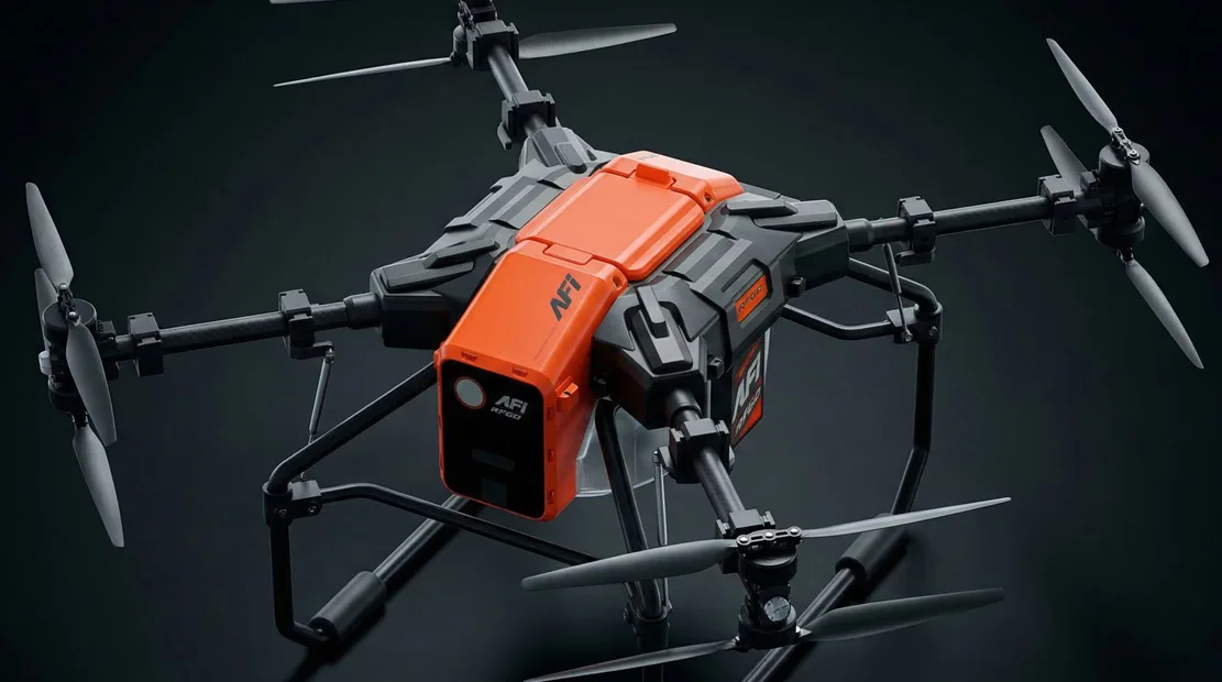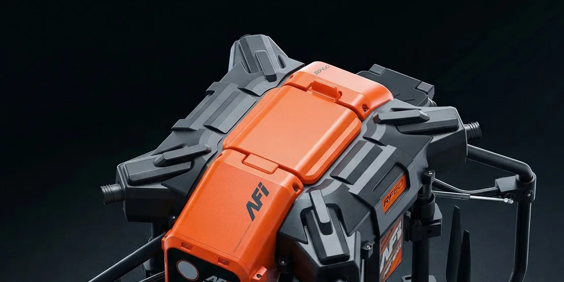 The AF-120 agricultural drone, designed by HOONSTUDIO for AFI, exemplifies the integration of industrial strength with refined design language. Its concept revolves around visualizing structural power and functional precision. With an expansive frame spanning 2.46 meters, the octagonal symmetry and the clean, stretched arms of its eight-rotor configuration evoke a strong sense of balance and mechanical trust. The form, defined by the interplay of sharp lines and subtle curves, creates both dynamism and stability in flight.