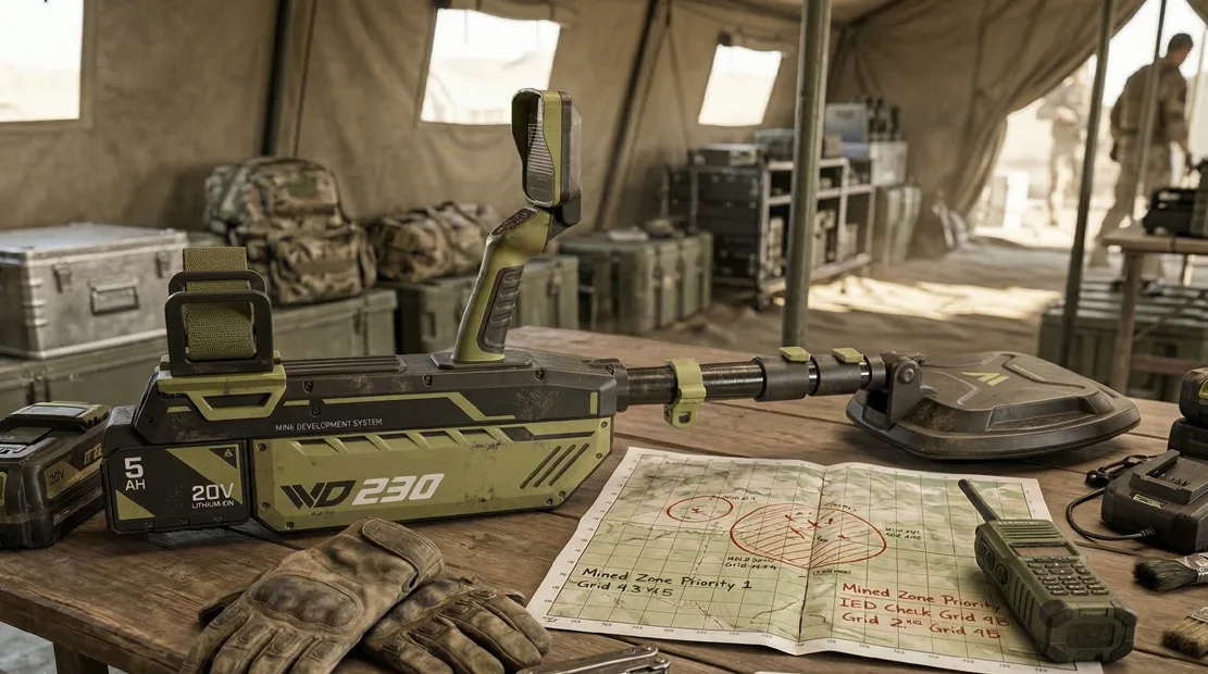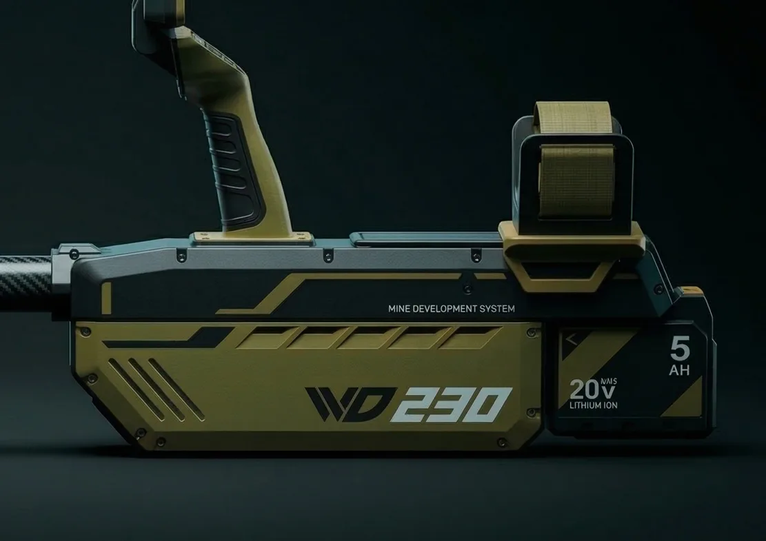HOONSTUDIO에서 디자인한 이 지뢰탐지기는 단순한 기능성 장비의 범주를 넘어서, 미래지향적인 조형성과 직관적인 형태미를 갖춘 하나의 완성도 높은 산업 디자인 제품으로 완성되었습니다. 제품 전반에 걸쳐 관찰되는 디자인 언어는 강인함과 민첩함을 동시에 담고 있으며, 그 외형적 조형은 사용자가 한눈에 이 장비의 목적성과 신뢰성을 인지할 수 있도록 정제되어 있습니다.